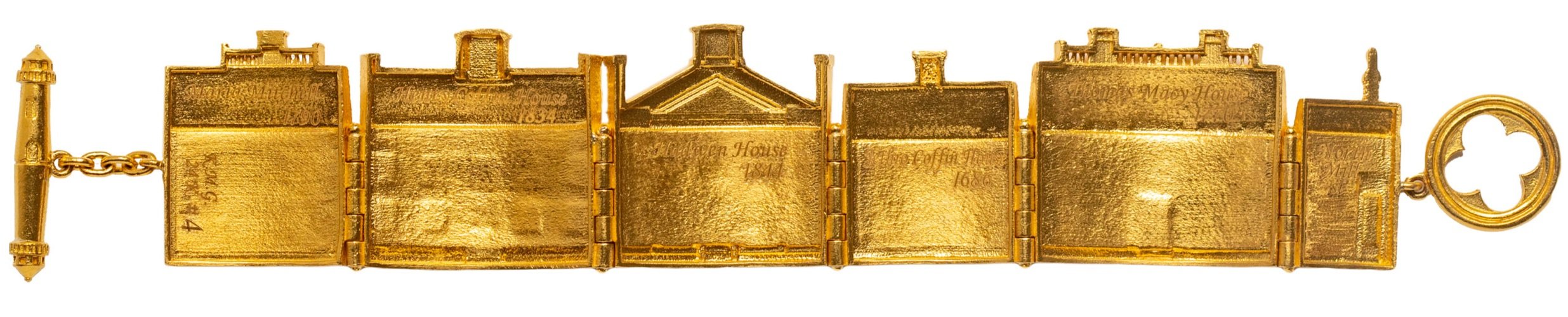 The Nantucket Bracelet was designed in celebration of those beautiful old homes that I have lived among, off and on, for 60 years. The bracelet consists of 6 panels, each of which is an antique residence on the island of Nantucket.The reverse of the bracelet is engraved with the name of the first owner of the house and the year it was built. These residences range from the more formal and grand  to the smallest and most modest of homes built on island in the 17th, 18th, and 19th centuries. The toggle is made of two versions of Great Point Lighthouse belly to belly, the finials on the hinges between panels are fashioned after a newel post design in a book of old Nantucket homes, and the ring on the clasp is modeled after an architectural detail  from the Congregational Church on Centre St. The 24K version of this bracelet is in a limited and numbered series.