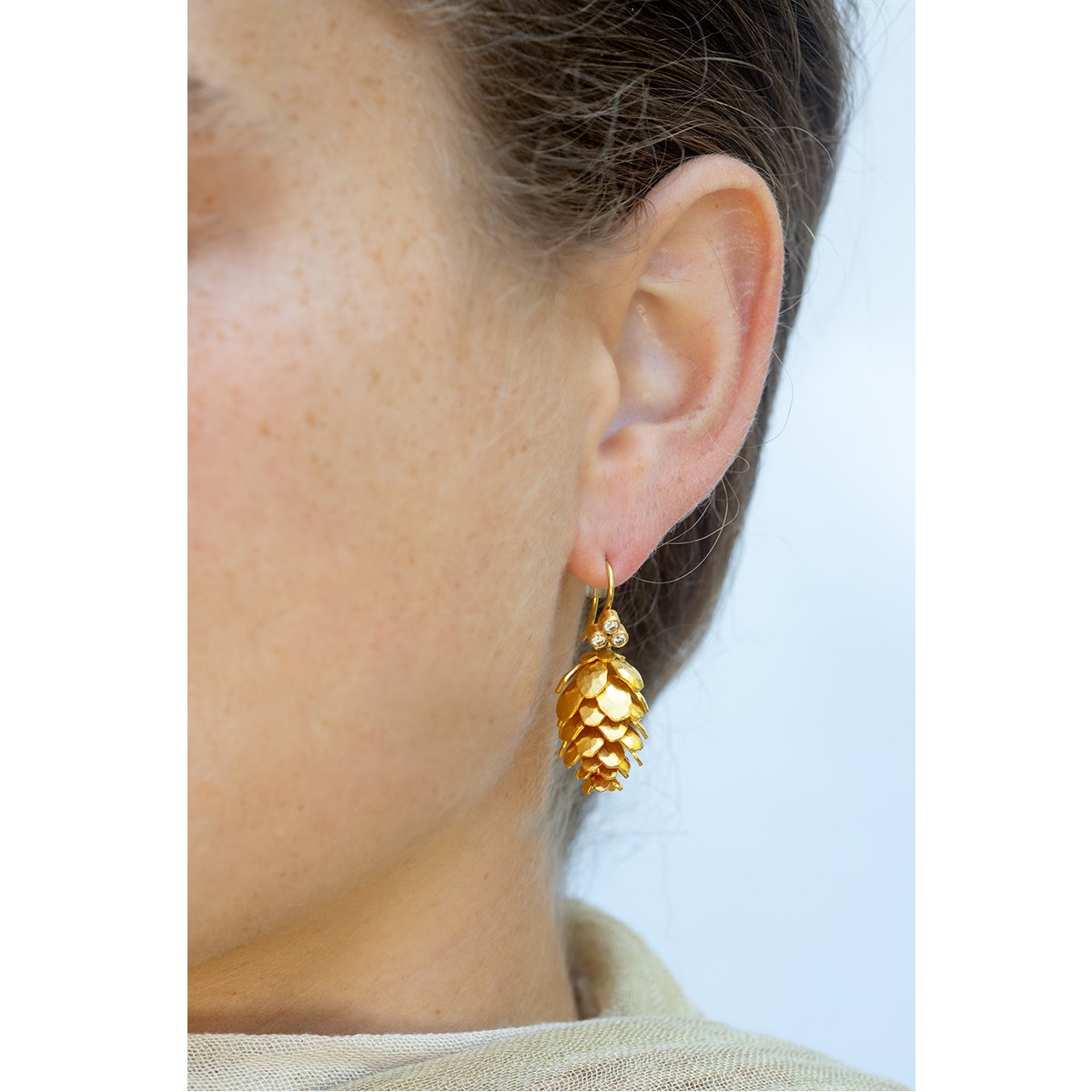 Image 1 of 2 Image 2 of 2 Pinecone Earrings with Diamond Triplets $0.00 Please contact us KGE-03316.6 grams of 24k gold total weight and .21 carats of diamonds22mm long by 15mm wide and add 13mm for french wire Please contact us Added! KGE-03316.6 grams of 24k gold total weight and .21 carats of diamonds22mm long by 15mm wide and add 13mm for french wire
