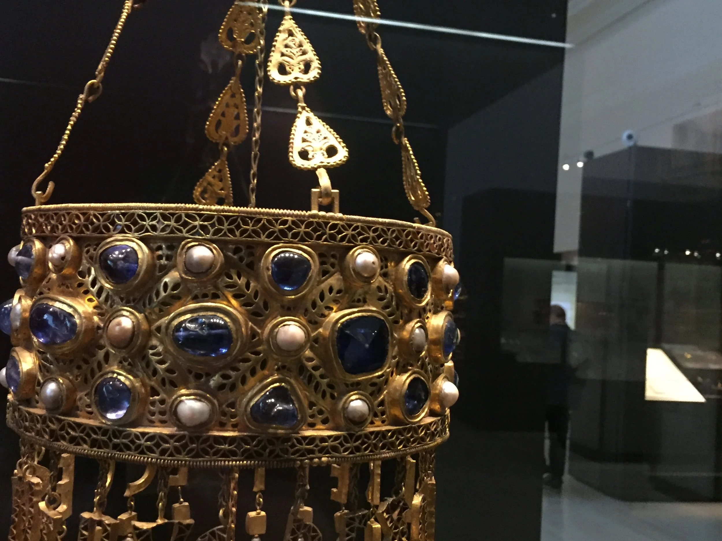 The inspiration for this bracelet appears in many books on Byzantine jewelry. While taking a course in Madrid, I had the good fortune to see it in person at the National Archeology Museum. The piece was made as a "votive crown" that would have been suspended over a statue, likely in a basilica. Its design reveals many clues to its history. The patron is recorded by the letters hanging below the crown: King Reccesvinth. Reccesvinth was a local Visigothic king of an area in Toledo Province, Spain from 649-672. This gift to the church would have demonstrated the King's piety and his submission to the church. The arrival of Islam in Spain in 711 put pressure on Christianity and is likely why this and other votive crowns and precious artifacts were buried. Together they are referred to as the Guarrazar Hoard. The hoard was discovered in an orchard between 1858 and 1861. Today it resides in three different museums in Madrid and Paris and represents a high point in Visigothic or Byzantine goldsmith's work.
